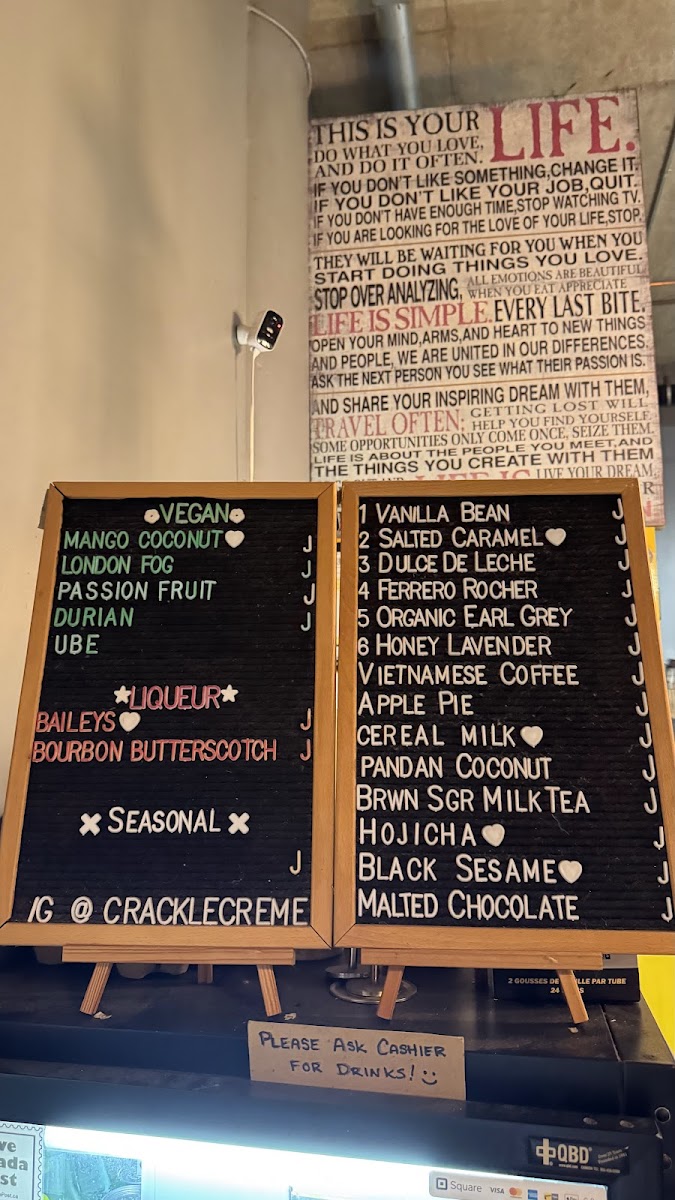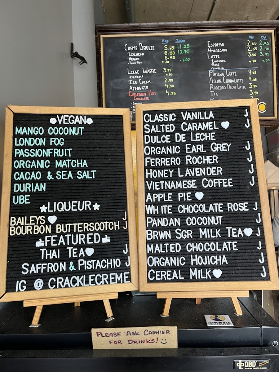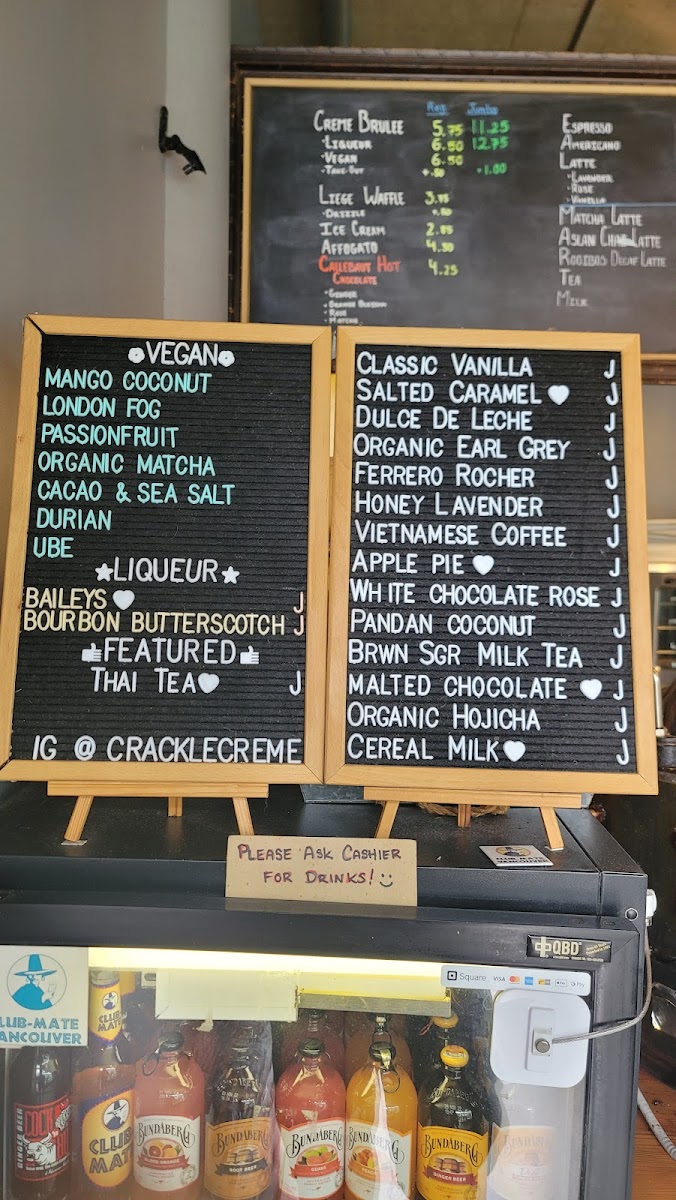 In addition to their delectable desserts, Crackle Creme also offers a variety of beverages, including the refreshing Iced Vietnamese Coffee and the rich Callebaut Hot Chocolate.